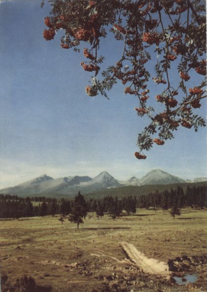 Widok na zachodni fragment Tatr Wysokich. Od lewej: Krywań, Ostra, Solisko, Szczyrbski Szczyt i Skrajna Baszta. Tytuł również w języku: ros., ang., niem.