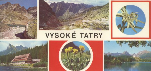 Tatry Wysokie. Widok ze szlaku na Rysy na Wołow± Turnię, Żabi± Turnię i Żabi Koń, pod nimi Wyżni Żabi Staw Mięguszowiecki. Widok na Grań Baszt z Szatanem z przełeczy Waga. Szarotka alpejska. Panorama od Szczyrbskiego Jeziora, (z lewej) Krywań, grań Ostrej, Solisko, Szczyrbski Szczyt i Skrajna Baszta z Grani± Baszt. Prosienicznik jednogłówkowy. Hotel górski im. kpt. Morávku nad Popradzkim Stawem.