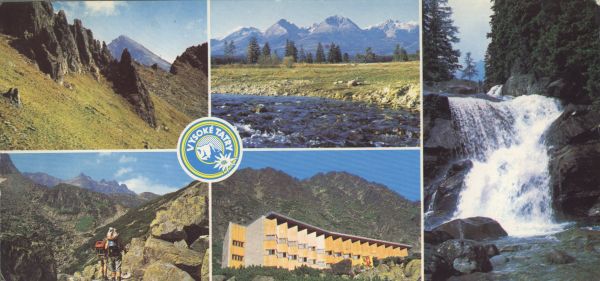 Pocztówka 5. elementowa: Dolina Wielicka. Widok od południa na Gerlach. Szlak do Schroniska Zbójnickiego w Dolinie Starole¶nej. Hotel górski Šl±ski Dom. Wodospad Zimnej Wody. LOgo miasta Vysoké Tatry.