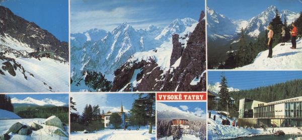 Pocztówka 7. elementowa: Schronisko Téryego, w tle Łomnica. Widok z Łomnicy ponad Dolinę Małej Zimnej Wody. Widok z Magistrali Tatrzańskiej do Doliny Starole¶nej (z lewej) i Doliny Małej Zimnej Wody (z prawej). Tępa (z lewej), Kończysta i Gerlach. Nowy Smokowiec, hotel Tokajík. Nowy Smokowiec, hotel Park. Stary Smokowiec, dom handlowy Mladost. Napis: Vysoké Tatry.