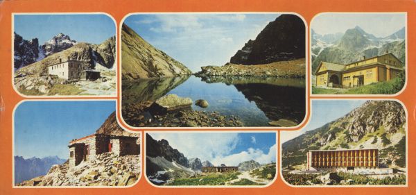Pocztówka 6. elementowa: Schronisko Téryego w Dolinie Pięciu Stawów Spiskich, w tle Mały Lodowy Szczyt. Mały Staw Spiski. Schronisko nad Zielonym Stawem Kieżmarskim, w tle Czarny Szczyt. Schronisko pod Rysami. Schronisko Zbójnickie w Dolinie Starole¶nej. Hotel górski ¦l±ski Dom w Dolinie Wielickiej.