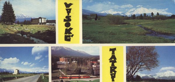 Pocztówka 5. elementowa: Hotel Krywań w Podbańskiej, w tle Krywań. Widok na Krywań z Liptowa. Hotel Esperanto w Przybylinie, w tle Krywań. Widok ogólny na Nowy Smokowiec. Krywań. Napis: VYSOKÉ TATRY.