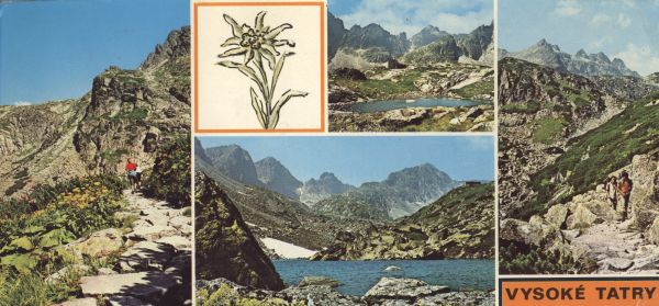 Pocztówka 5. elementowa: Dolina Małej Zimnej Wody. Schronisko Téryego w Dolinie Pięciu Stawów Spiskich. Długi Staw w Dolinie Staroleśnej. Turyści na szlaku w Dolinie Staroleśnej. Rysunek szarotki i napis: Wysokie Tatry.
