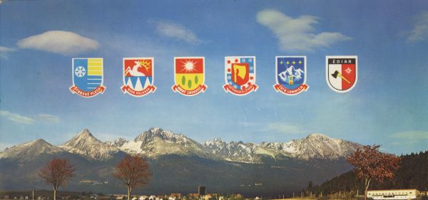 Panorama Tatr Wysokich z Mięguszowiec. Od lewej: Tępa z Klinem, Kończysta, Batyżowiecki Szczyt, Gerlach, Staroleśny Szczyt, Sławkowski Szczyt. Pośrodku sześć herbów miast Wysokich Tatr.