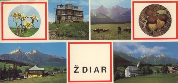 Pocztówka 6. elementowa: Szarotka alpejska (Leontopodium alpinum). Hotel turystyczny ProteŸka w Zdziarze. Hotel turystyczny źdiaranka w Zdziarze. Widok na fragment wsi Zdziar z ko¶ciołem. Pastwisko w Zdziarze, w tle Płaczliwa Skała i Hawrań. Borowik szlachetny (Boletus edulis Bull.). Napis: źDIAR.