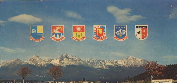 Panorama Tatr Wysokich z Mięguszowiec. Od lewej: Tępa z Klinem, Kończysta, Batyżowiecki Szczyt, Gerlach, Staroleśny Szczyt, Sławkowski Szczyt. Pośrodku sześć herbów miast Wysokich Tatr.