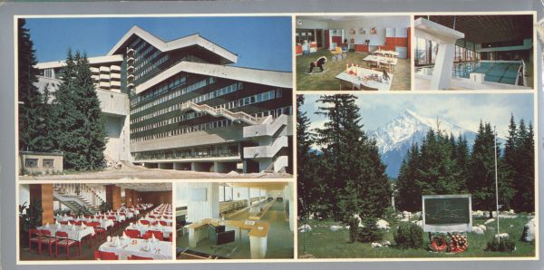 Pocztówka 6. elementowa: Hotel Permon w Podbańskiej - jadalnia, kręgielnia, kącik dziecięcy, pływalnia. Widok na Krywań.