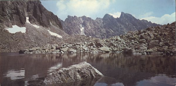POÉZIA TATIER. VYSOKÉ TATRY - VYSOKIE TATRY. HOHE TATRA - THE HIGH TATRAS. Mlynická dolina, pohľad od Capieho plesa (2072 m) na Capie veže, Zadnú Baštu a Satana (2476 m).