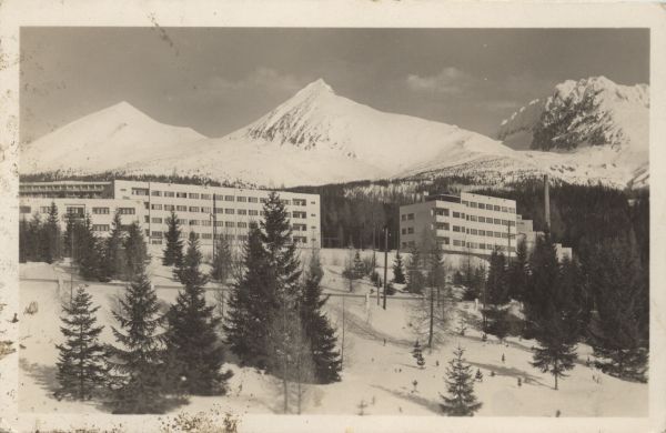 Wyżnie Hagi. Budynki sanatorium Robotniczego Towarzystwa Opieki Społecznej i ich otoczenie w scenerii zimowej. W tle szczyty: Tępa, Kończysta, Gerlach.