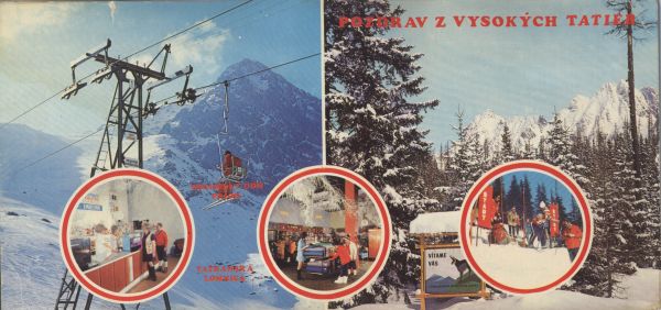 Pocztówka 5. elementowa: Kolej linowa krzesełkowa na Łomnicki Grzebień, w tle Łomnica. Widok na Wysoką. Wnętrza domu handlowego Prior w Tatrzańskiej Łomnicy. Zawody narciarskie VCS na Siodełku. Napis: POZDRAV Z VYSOKÝCH TATIER.
