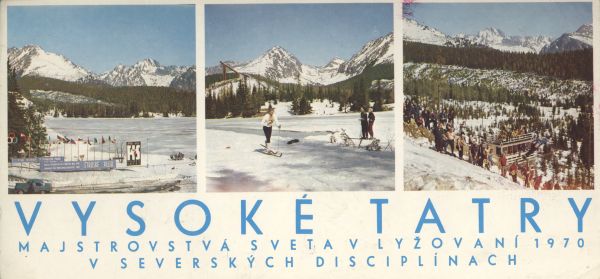 Pocztówka 3. elementowa: Mistrzostwa Świata w narciarstwie 1970 w dyscyplinach nordyckich. Na dole napis: VYSOKÉ TATRY Majstrovstvá sveta v lyžovaní 1970 v severských disciplínach.