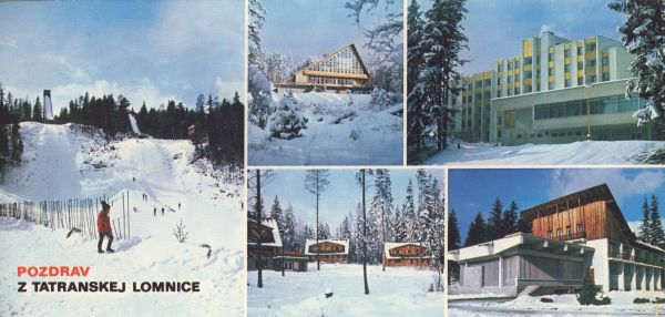 Pocztówka 5. elementowa: Skocznie narciarskie w Jamach. Dolna stacja kolei linowej gondolowej do Doliny Łomnickiej. Hotel Slovan. Domki Kysuce. Poczta. Napis: POZDRAV Z TATRANSKEJ LOMNICE