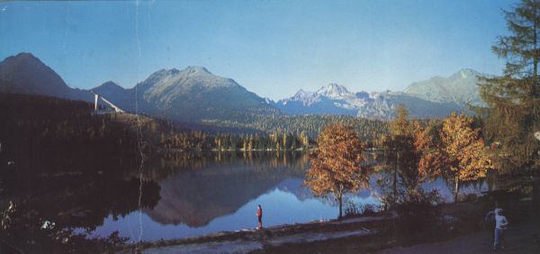 VYSOKÉ TATRY. VYSOKIE TATRY - HOHE TATRA - THE HIGH TATRAS ©trbské Pleso (1355 m). Pohµad na panorámu Vysokých Tatier: ©trbské Solisko (2301 m, vµavo), ©trbský ątít (2385 m), hrebeň Báąt s Patriou (2203 m), Kôpky (2354 m), ątvorvrchol Vysokej (2560 m), Tupá (2284 m) a Končistá (2535 m).