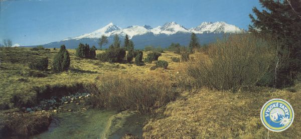 Panorama Tatr Wysokich od Szczyrby. Od lewej: Krywań, Krótka, Siodełkowa Kopa, Ostra, Furkot, Solisko, Szatan i Skrajna Baszta. Na dole logo miasta Vysoké Tatry.