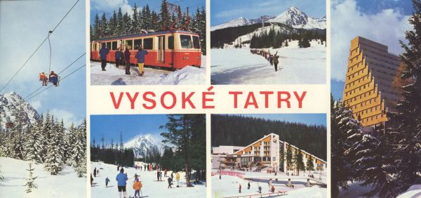 Pocztówka 6. elementowa: Szczyrbskie Jezioro. Kolej linowa krzesełkowa z Doliny Młynickiej na Solisko. Kolej zębata. Narciarze na Szczyrbskim Jeziorze. Jazda na nartach w Dolinie Młynickiej, w tle Solisko. Hotel FIS. Hotel Panorama. Napis: VYSOKÉ TATRY.