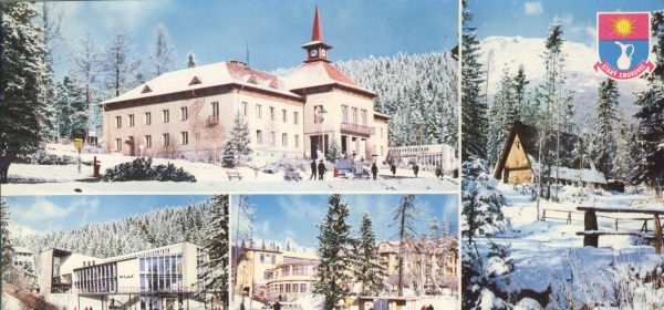 Pocztówka 4. elementowa: Stary Smokowiec w zimie. Urz±d miejski. Dom handlowy Mlados». Hotel Grand. Winiarnia Zbojnícka koliba, w tle Sławkowski Szczyt. Dodatkowo herb miasta Starę Smokovec.