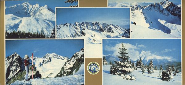 Pocztówka 5. elementowa: Widok z Furkotu na Grań Baszt. Gerlach z Gerlachowskim Kotłem i Małym Gerlachem. Po¶rednia Grań, Mały Lodowy Szczyt, Lodowa Kopa z Lodowym Szczytem. Krywań, Krótka i grań Ostrej. Krywań. Logo miasta VYSOKÉ TATRY.