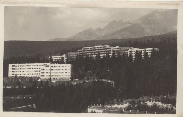 Wyżnie Hagi. Sanatorium przeciwgruźlicze i jego otoczenie. Na pierwszym planie serpentyny drogi dojazdowej. W tle szczyty Tatr Wysokich.
