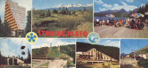 Hotel Panorama. Widok na Tatry Wysokie od Szczyrby. Szczyrbskie Jezioro. Kolej linowa krzesełkowa na skocznie narciarskie. Skocznie narciarskie. Hotel FIS. Górna stacja kolei linowej krzesełkowej na Solisko.