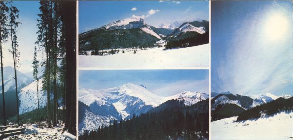 Pocztówka 4. elementowa: Jaworzyna Tatrzańska. Widok ponad Dolinę Jaworow± na Kołowy Szczyt. Murań, w tle Jagnięcy Szczyt, Kołowy Szczyt i Lodowy Szczyt. Szeroka Jaworzyńska, z lewej ¦wistowa Góra, z prawej Spismichałowa Czuba. Widok od Jaworzyny Tatrzańskiej na Szerok± Jaworzyńsk±, z prawej w tle Lodowy Szczyt.