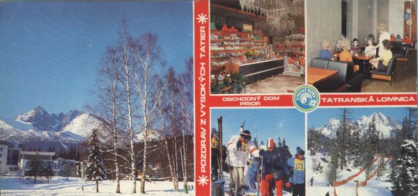 Pozdrowienia z Wysokich Tatr. Wysokie Tatry. Dom wypoczynkowy RZZ Morava z grup± Łomnicy i Kieżmarskiego Szczytu w tle. Dom handlowy Prior w Tatrzańskiej Łomnicy, dział drogerii. Dom handlowy Prior w Tatrzańskiej Łomnicy - bar. Na starcie VCS na Siodełku. Zimowa panorama Tatr Wysokich z Wysok±.