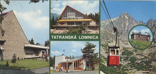 Obserwatorium astronomiczne w Dolinie Łomnickiej. Pomiędzy zdjęciami napis: TATRANSKÁ LOMNICA.