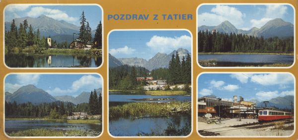 Pocztówka 5. elementowa: Nowe Szczyrbskie Jezioro - widok na Solisko, Skrajn± Basztę, Kończyst± i Wołowiec Mięguszowiecki. Wagon kolei zębatej na stacji w Szczyrbskim Jeziorze. Napis: POZDRAV Z TATIER.