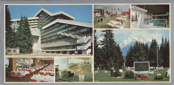 Pocztówka 6. elementowa: Hotel Permon w Podbańskiej - jadalnia, kręgielnia, kącik dziecięcy, pływalnia. Widok na Krywań.