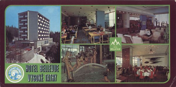Pocztówka 5. elementowa: otoczenie i wnętrza hotelu Bellevue w Górnym Smokowcu. Napis: HOTEL BELLEVUE, VYSOKÉ TATRY i logo miasta VYSOKÉ TATRY oraz logo hotelu.