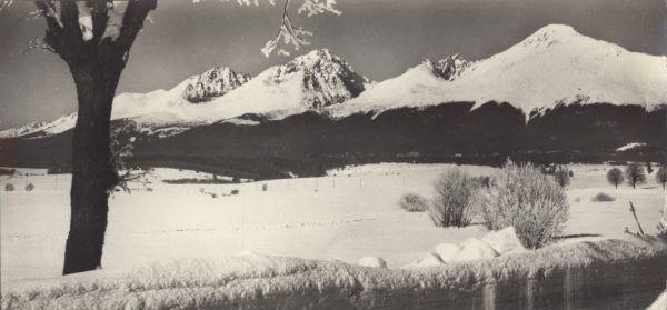 Poh”ad na Vysoké Tatry od juhovęchodu. Z”ava Konèistá (2535 m), Gerlachovskę čtít (2655 m), Bradavica (2476 m) a Slavkovskę čtít (2452 m).