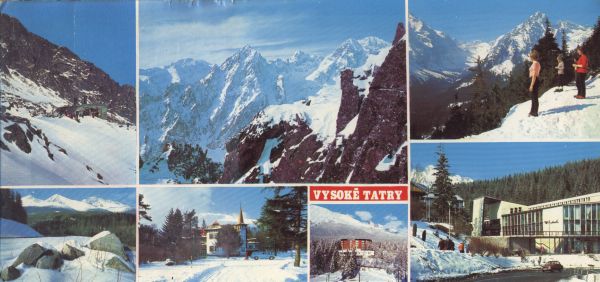 Pocztówka 7. elementowa: Schronisko Téryego, w tle Łomnica. Widok z Łomnicy ponad Dolinę Małej Zimnej Wody. Widok z Magistrali Tatrzań¶kiej do Doliny Starole¶nej (z lewej) i Doliny Małej Zimnej Wody (z prawej). Tępa (z lewej), Kończysta i Gerlach. Nowy Smokowiec, hotel Tokajík. Nowy Smokowiec, hotel Park. Stary Smokowiec, dom handlowy Mladost. Napis: Vysoké Tatry.