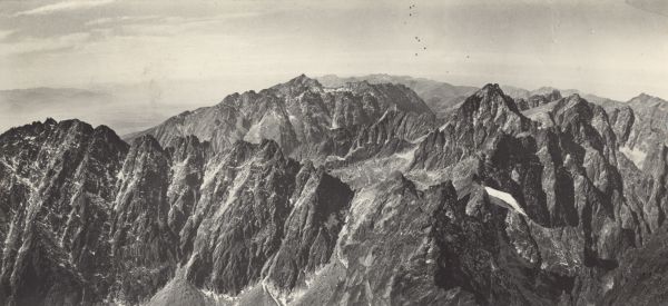 Widok z Gerlachu na zachód. W tle Krywań, Wysoka, przełęcz Waga i Rysy. W przodzie z lewej grań Kończystej.