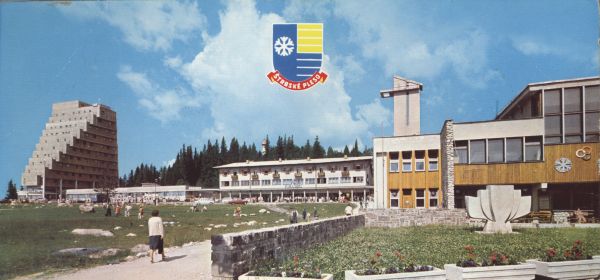 Szczyrbskie Jezioro. Hotel Panorama, dom handlowy Prior i stacja kolei elektrycznej. U góry herb Štrbské Pleso.