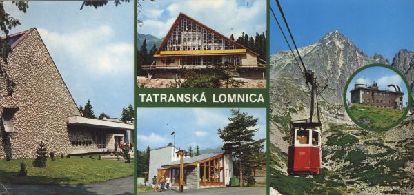 Obserwatorium astronomiczne w Dolinie Łomnickiej. Pomiędzy zdjęciami napis TATRANSKÁ LOMNICA.