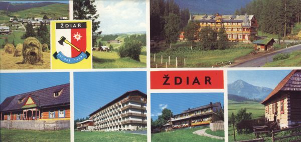 Pocztówka 7 elementowa: Widok ogólny oraz zabudowania hotelowe w Zdziarze. Pomiędzy zdjęciami napis: ®DIAR i herb Zdziaru.