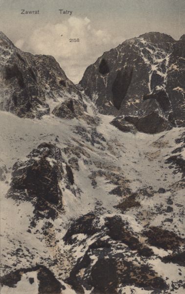Widok na przełęcz Zawrat od Doliny G±sienicowej zim±. U góry drukowany tytuł.