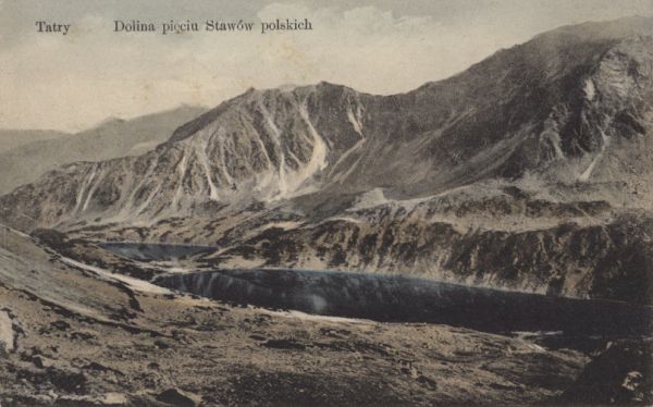 Dolina Pięciu Stawów Polskich. W dole Przedni i Wielki Staw Polski. Nad nimi Świstówka Roztocka i Opalony Wierch. U góry drukowany tytuł.