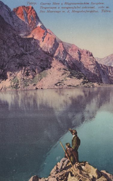 Turyści nad Czarnym Stawem pod Rysami. W tle Mięguszowiecki Szczyt Wielki. U góry wydrukowany tytuł, również w języku węgierskim i niemieckim.