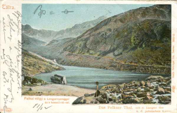 Długi Staw w Dolinie Wielickiej. W tle Polski Grzebień. Pod zdjęciem drukowany tytuł, w języku węgierskim i niemieckim. Na marginesie po prawej stronie informacje wydawcy. Korespondencja.