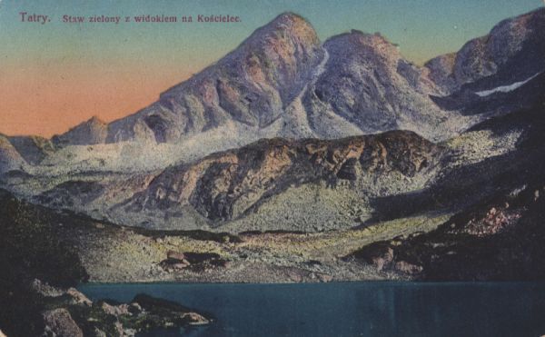 Kościelec nad Zielonym Stawem Gąsienicowym. U góry wydrukowany tytuł.