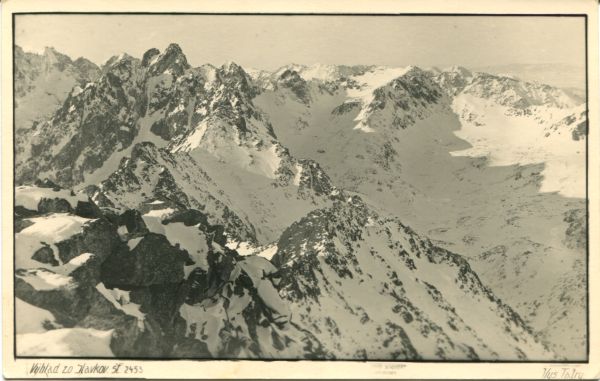 Widok ze Sławkowskiego Szczytu na Dolinę Staroleśną w zimie. Pod zdjęciem wpisany tytuł i nazwisko fotografa.