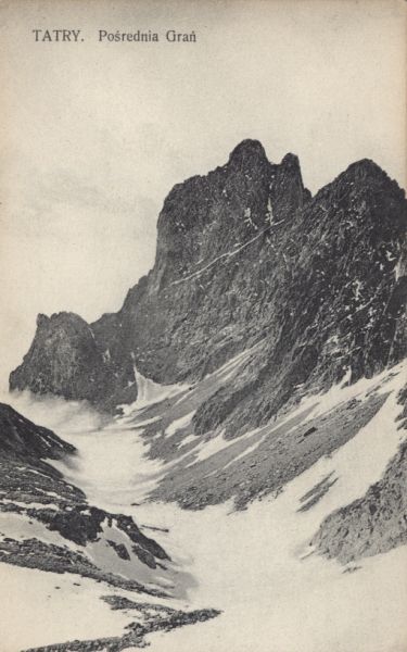 Pośrednia Grań i Żółty Szczyt nad Doliną Pięciu Stawów Spiskich. U góry wydrukowany tytuł.