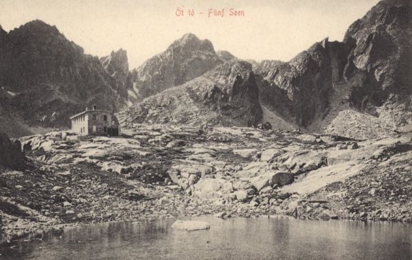 Schronisko Téryego w Dolinie Pięciu Stawów Spiskich. W dole Mały Staw Spiski. W tle Spąga, Czerwona Ławka, Mały Lodowy Szczyt i Pięciostawiańska Kopa. U góry wydrukowany tytuł, również w języku niemieckim.
