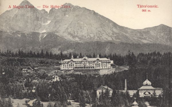 Widok ogólny na Tatrzańską Łomnicę. Nad parkiem zdrojowym Grand Hotel Praga, w tle Łomnica i Kieżmarski Szczyt. U góry wydrukowany tytuł, także w języku niemieckim.
