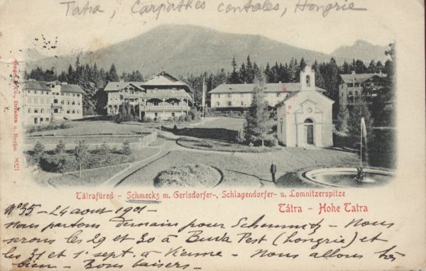 Stary Smokowiec. W tle Sławkowski Szczyt i Łomnica. Pod zdjęciem wydrukowany tytuł, na marginesie po lewej stronie wydawca. Korespondencja.