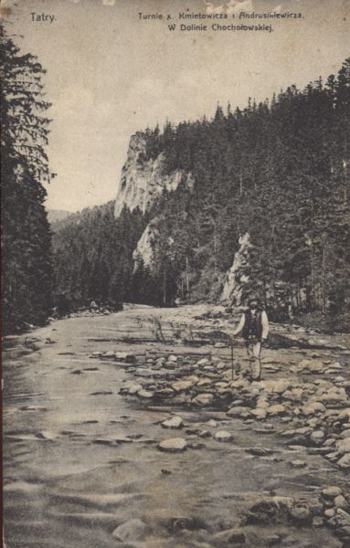 Góral stojący przy Potoku Chochołowskim przed Niżną Bramą Chochołowską. U góry drukowany tytuł.
