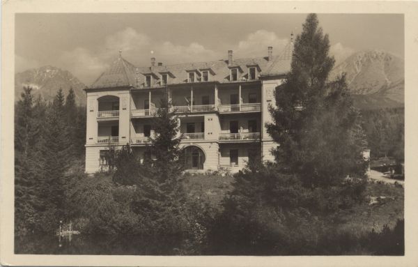 Pensjonat Tatrzański Dom w Tatrzańskiej Polance w otoczeniu drzew. W tle Gerlach i Sławkowski Szczyt.
