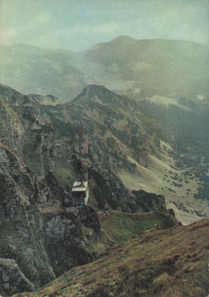 Widok z Kasprowego Wierchu na wagonik kolei linowej w Kasprowej Dolinie.