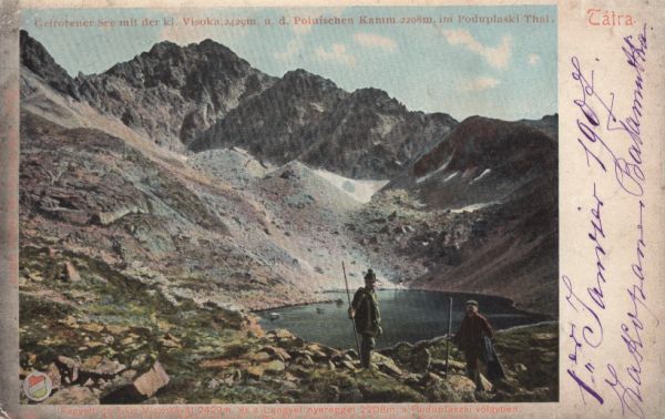 Turyści nad Zmarzłym Stawem w Dolinie Litworowej. W tle z lewej Mała Wysoka, z prawej Polski Grzebień. U góry wydrukowany tytuł, pod zdjęciem tytuł także w języku: niem i pol., na marginesie po lewej stronie wydawca.