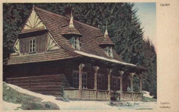 Leśniczówka na Łysej Polanie. Na marginesie po prawej stronie wydrukowany tytuł.